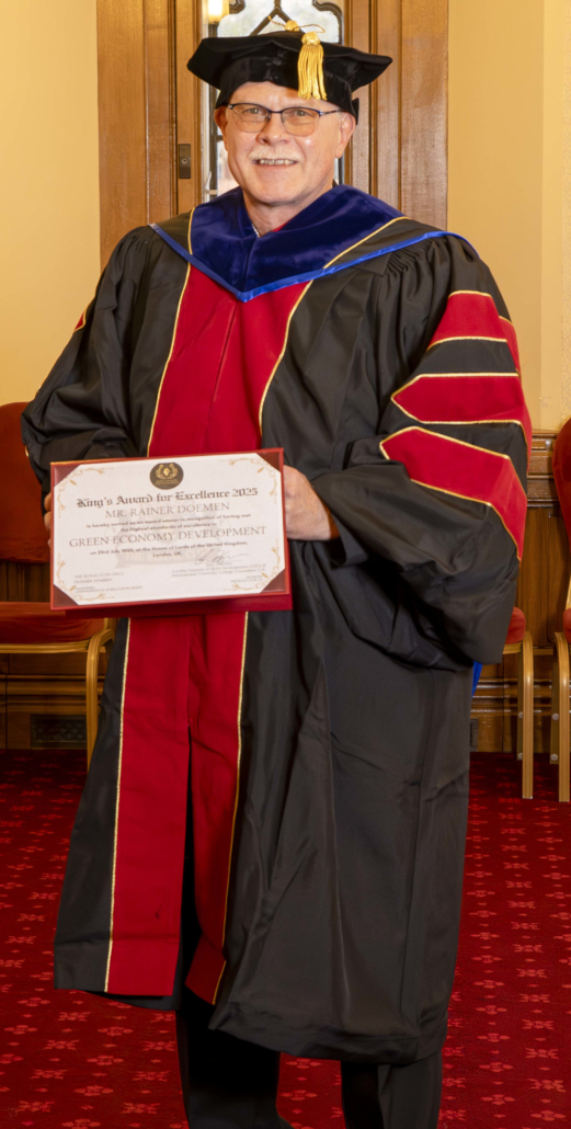 Zusätzlich zur Preisverleihung wurde Rainer Doemen vom Royal Club zum Royal Ambassador für Deutschland und Europa ernannt. In dieser neuen Rolle wird er künftig vom “The Royal Club” (Link) zu Veranstaltungen und Foren einbezogen– insbesondere im Themenfeld ökologische Nachhaltigkeit, Klimaengagement und zivilgesellschaftliche Innovationen.